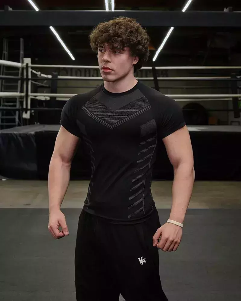 Camiseta masculina de corrida com elastano, secagem rápida e tecido respirável para treinos intensos.